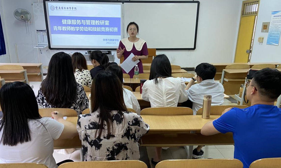 为深入学习贯彻习近平新时代中国特色社会主义思想,落实全国教育大会精神,弘扬劳模、劳动和工匠精神,提升青年教师教学能力和水平。2022年5月5日,体育与健康教育学院健康服务与管理教研室在1208教室,举行了青年教师教学劳动和技能竞赛初赛。
