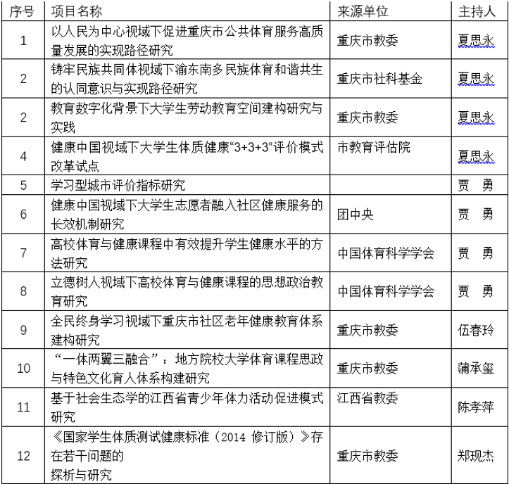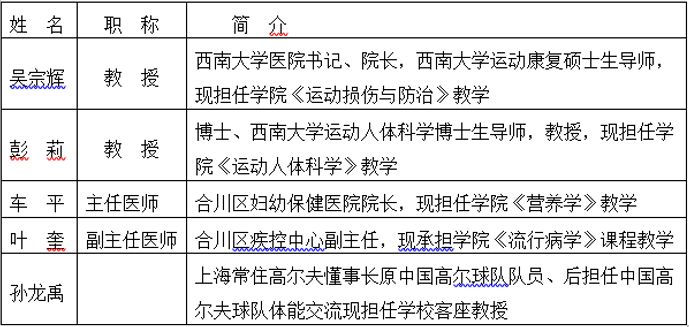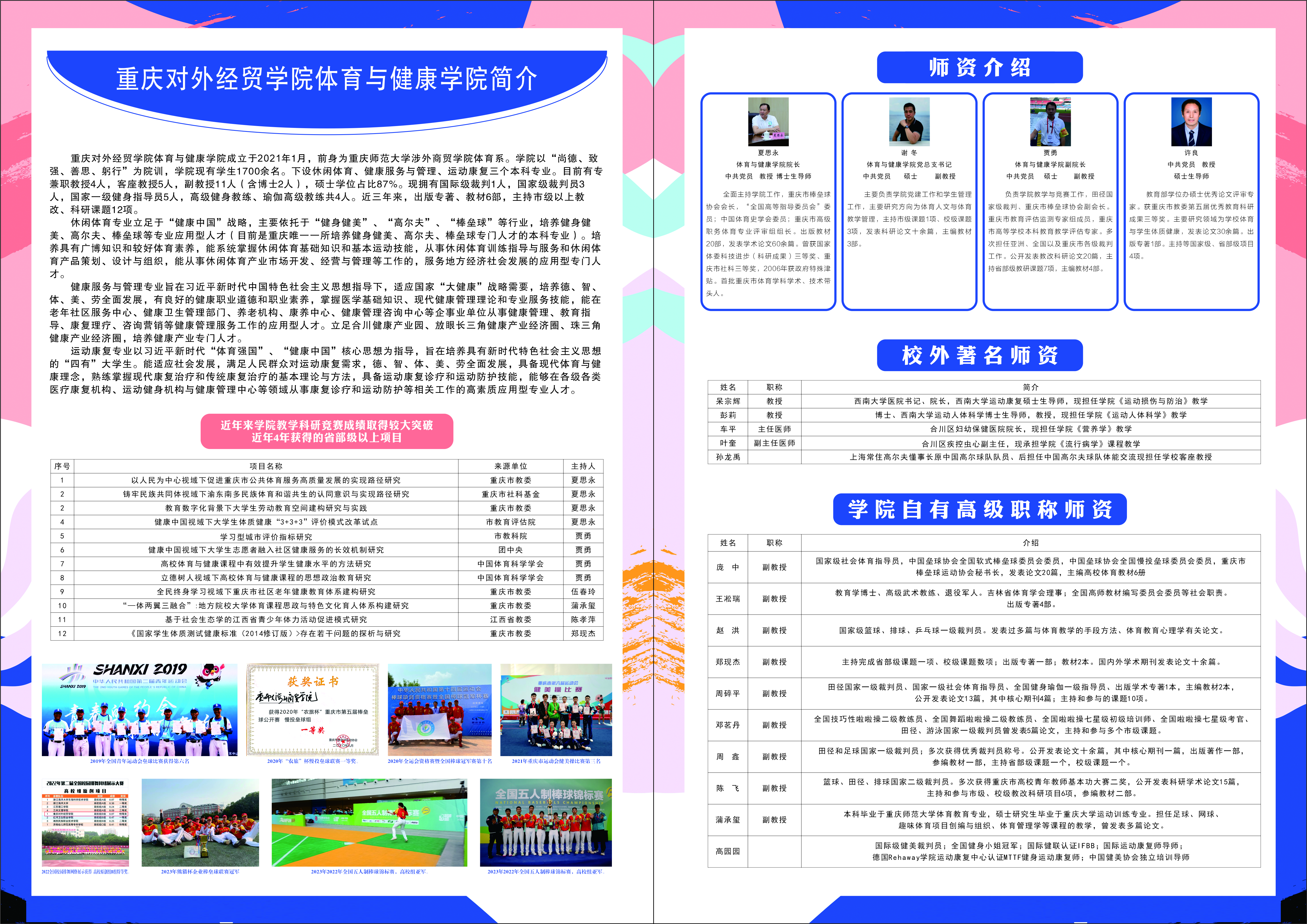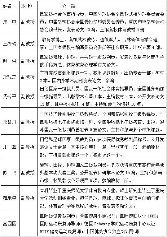 6163银河.net163.am成立于2021年1月,前身为重庆师范大学涉外商贸学院体育系。学院以“尚德、致强、善思、躬行”为院训,学院现有学生1700余名。下设休闲体育、健康服务与管理、运动康复三个本科专业。目前有专兼职教授4人,客座教授5人,副教授11人(含博士2人),硕士学位占比87%。现拥有国际级裁判1人,国家级裁判员3人,国家一级健身指导员5人,高级健身教练、瑜伽高级教练共4人。近三年来,出版专著、教材6部,主持市级以上教改、科研课题12项。